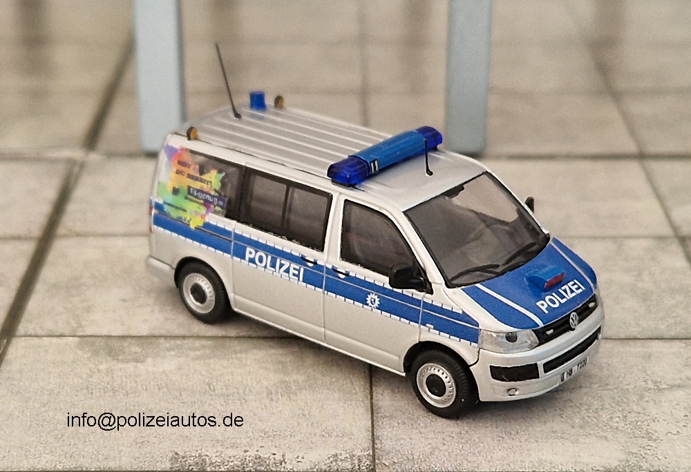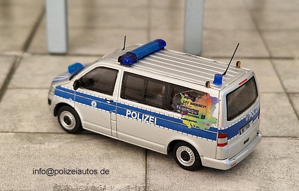 Das Grundmodell von Rietze wurde zerlegt und mittels Airbrush in silber lackiert. Nach dem Trocknen wurden Decals von SRM87 aufgebracht. Desweiteren wurden sämtliche Details wie Antennen, Blaulichtbalken, Blaulicht, Anhaltesignalgeber und Dachblinker hervorgehoben.