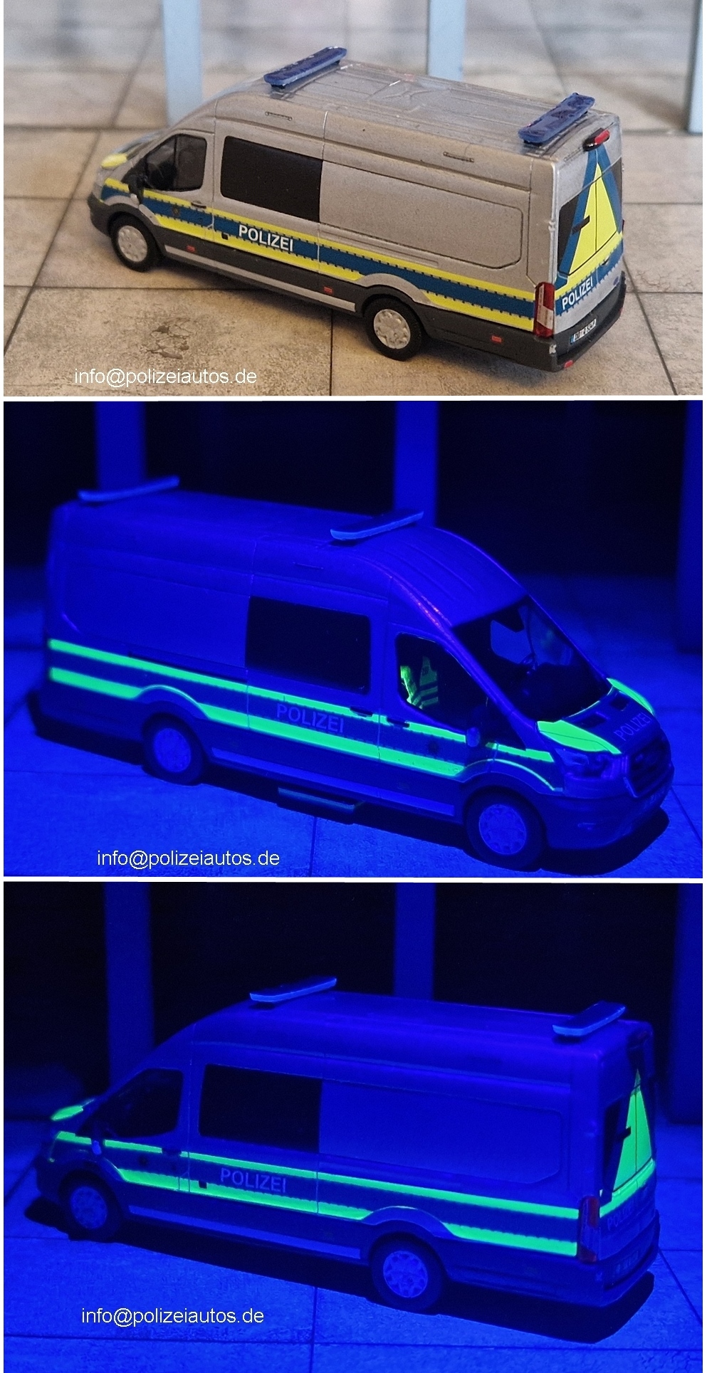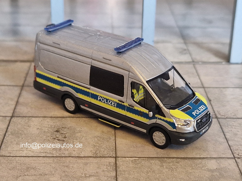 Das Resin-Modell von MOrDec-decals, parts and more wurde mittels Airbrush in silber lackiert. Nach dem Trocknen konnten Decals von MOrDec aufgebracht werden. Die Verglassung, Scheinwerfer und das Interieur musste noch von einem Busch Modell eingesetzt werden. Abschließend wurden sämtliche Details wie drittes Bremslicht mit Rückfahrkamera, Seitentritt (von M.B.S.K), Blaulichtbalken, Seitenspiegel (von Flavio Huneke Modellbau), Felgen (von Nico Gebauer) ergänzt.