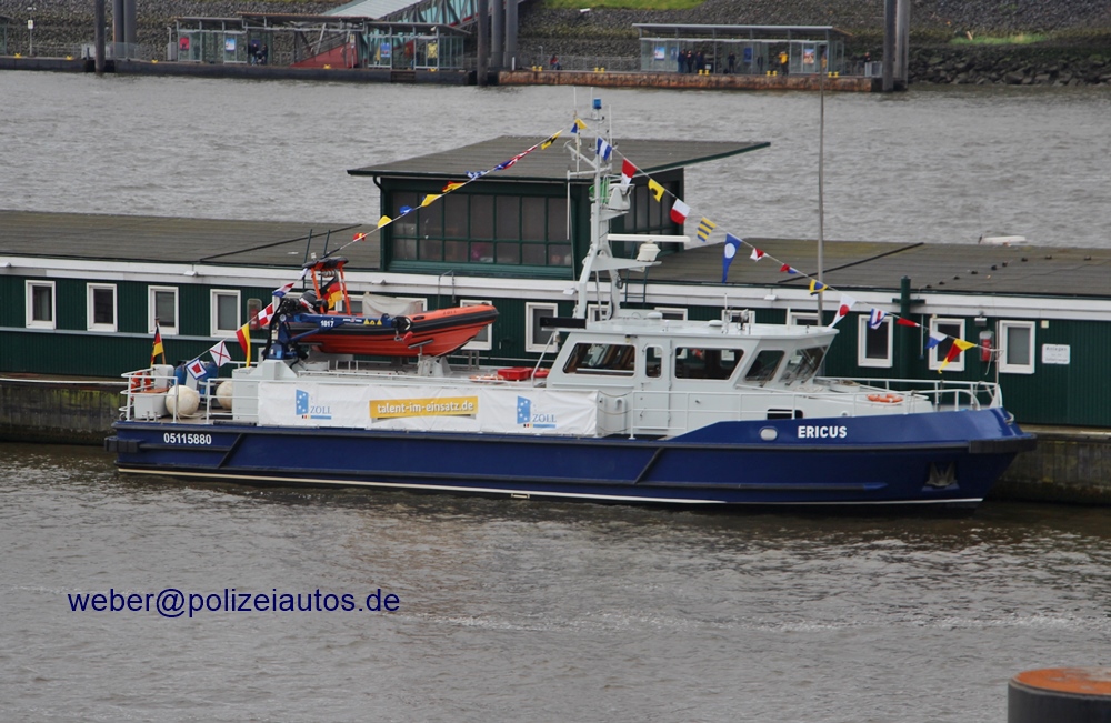Zollboot Ericus -nun auch in kobaltblau- im Hamburger Hafen, nahe den Landungsbrücken
