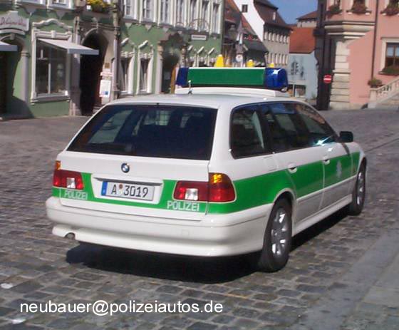 Funkstreifenwagen. Besonders untypisch für ein Fahrzeug der bay. Polizei ist die Beschriftung am Heck.
