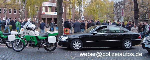 | Beschreibung: | Am 01.November 2004 weilte der Herr Bundespräsident, Horst Köhler, zu seinem Antrittsbesuch in der Stadt Braunschweig. Zu seiner Eskorte, Streckenschutz u.a., gesellten sich folgende, abgebildete, Dienstfahrzeuge; Kräder: BMW K 75, BMW R 80 RT, sowie Pkw VW Phaeton und Mercedes-Benz S-Klasse. Die 2. Ansicht zeigt u.a. das Fahrzeug des Bundespräsidenten (Kennzeichen: 0-1) mit Standarte des Bundespräsidenten. |
