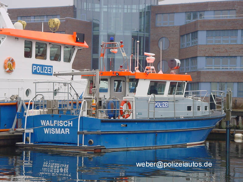 Streifenboot "Walfisch" der Wasserschutzpolizei des Landes Mecklenburg-Vorpommern im Heimathafen Wismar.