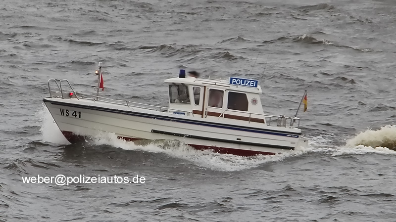 Beschreibung: | Boot WS 41, Hilfseinsatzboot Minor 7600 der Wasserschutzpolizei Hamburg. Modell: Minor 7600 Bauwerft: Sarins Batar, Finnland Länge: 7.60 m Breite: 2.60 m Tiefgang: 0.85 m Gewicht: ca. 2200 kg Baumaterial: Rumpf und Aufbauten aus GFK Antrieb: Volvo TAMD 31P mit Wendegetriebe u. Festpropeller Leistung: 110 kW Höchstgeschwindigkeit: ca. 18 kn Treibstofftank: ca. 300 Liter Tragfähigkeit: 10 Personen Fotos: Jörns u.a. |