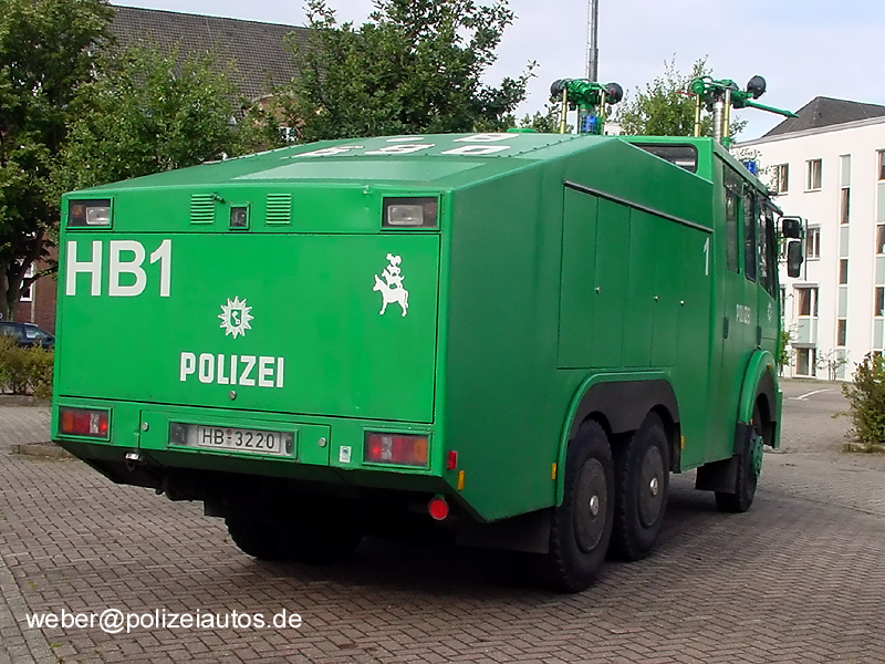 | Beschreibung: | Wasserwerfer 9000 (HB1) mit dem neuen, weiß/blauen Bremer Wappen auf der Front und den Seiten, sowie dem Logo der "Bremer Stadtmusikanten" auf dem Heck beklebt. |