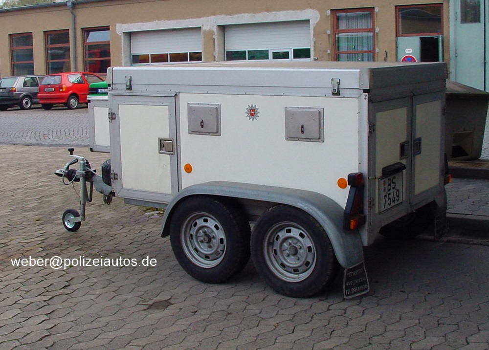 | Beschreibung: | Hundetransportanhänger der Polizei Niedersachsen mit Tandemachse. Es können vier Tiere transportiert werden. Technische Daten: Hersteller: WT-Metall Bamberg Typ: TH4 / 750B Baujahr: 1991 zul. Gesamtgewicht: 750 kg |
