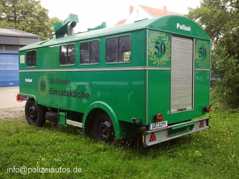 | Beschreibung: | Rollende Einsatzküche, Aufbauhersteller Voll/ Würzburg. 50 Jahre alt und noch heute (Stand August 2012) im Einsatz. Aus diesem Grund wurde der Anhänger mit einer entsprechenden "Jubiläumsbeklebung" versehen. Hierbei handelt es sich um das aktuell älteste Einsatzfahrzeug der niedersächsischen Polizei. |
