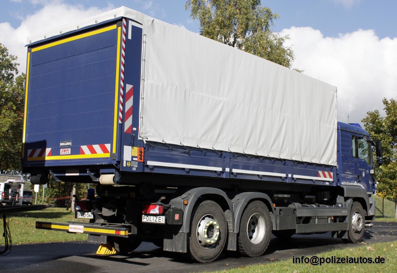 Fahrschulfahrzeug mit Wechselpritsche/-plane. Die WLF dieser Baureihe sind bisher nur in den Aus- und Fortbildungszentren der Bundespolizei vorhanden. Gegenüber den WLF der Einsatzabteilungen sind sie auf einem Straßenfahrgestell aufgebaut und verfügen über eine lange Kabine (L-Fahrerhaus). Fotos: Helmut Kunert (www.blaulichtwelten.de) |