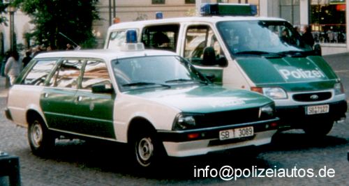 Funkstreifenwagen der saarländischen Polizei, hier mit einer rot/weißen Warnfolie am Heck