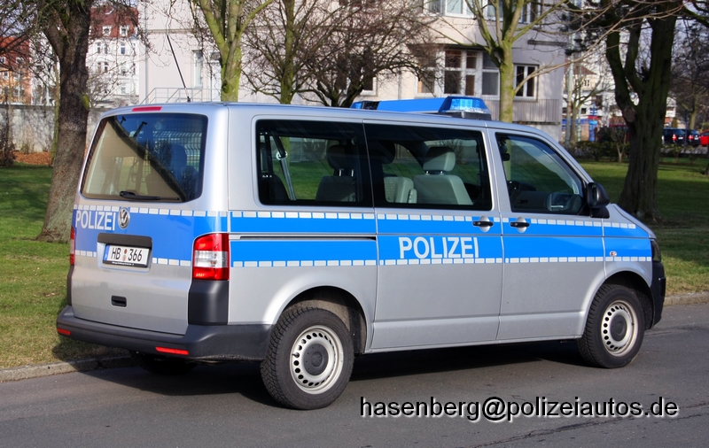 Neben der normalen Nutzung als FustW wird dieses Fahrzeug auch als Halbgruppenkraftwagen der Einzeldiensthundertschaft genutzt und besitzt deshalb auch eine zweite Schiebetür auf der linken Seite. Es fehlt auf den vorderen Türen der in Bremerhaven übliche Polizeistern. |