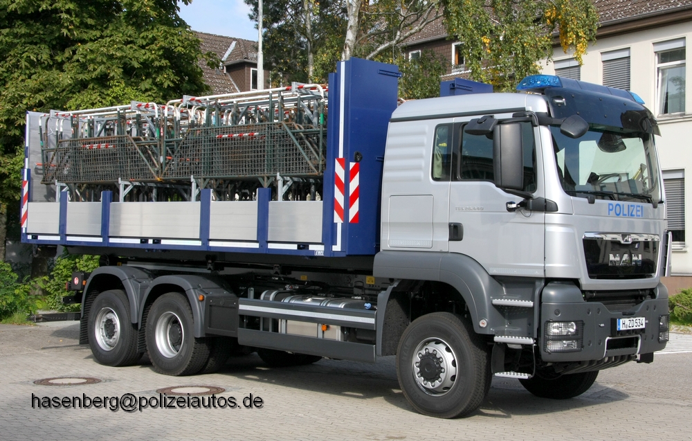 | Beschreibung: | Wechselladerfahrzeug der Polizei Niedersachsen. Seit 2017 ist bei der TEE Niedersachsen dieses Fahrzeug im Einsatz. Für das Wechselladerfahrzeug stehen verschiedene Arten von Abrollbehältern zur Verfügung. Als Abrollbehältereinrichtung findet hier eine Meiller RS 21.65, mit Fernsteuerung, Verwendung. Zum leichteren rangieren ist die Nachlauflenkachse zwangsgelenkt. Hier ist ein Abrollbehälter zur Aufnahme von Hamburger Gittern aufgesattelt. |
