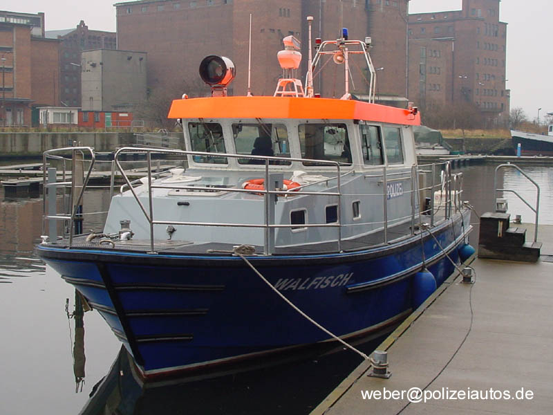 Streifenboot "Walfisch" der Wasserschutzpolizei des Landes Mecklenburg-Vorpommern im Heimathafen Wismar.