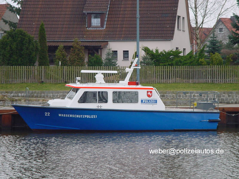 | Beschreibung: | Boot 22 der Wasserschutzpolizei im Hafen Vorsfelde. Inwischen wurde es in Nr. 16 umgekennzeichnet, leicht am Bugaufbau verändert (der Schutzbügel wurde gegen einen Einzelstab ausgetauscht) und nach Emden umstationiert. |
