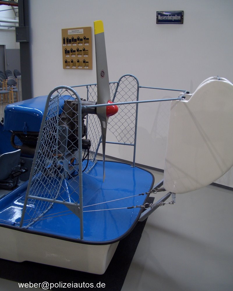 | Beschreibung: | Hilfsstreifenboot der nds. Wasserschutzpolizei Technische Daten: Baujahr: 1969 Besatzung: 1 Mann Fabrikat: Arko Gewicht: 585 kg mit vollem Tank Antrieb: VW-Industriemotor Typ 124A mit 54 PS Tiefgang: 0,10 m Geschwindigkeit: ca. 40 km/h auf dem Wasser, ca. 70-120 km/h auf Schnee / Eis. Verwendung: Streifen- und Einsatzfahrten während der Wintermonate auf dem Steinhuder Meer. Das Fahrzeug befindet sich in der Polizeigeschichtlichen Sammlung Niedersachsen und kann dort besichtigt werden. |