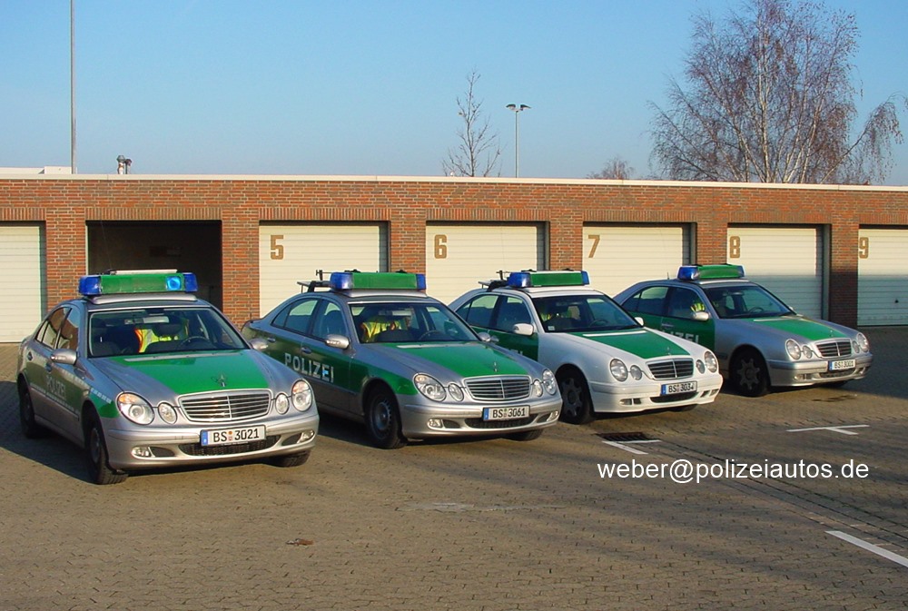 | Beschreibung: | BAB-E-Klasse-Funkstreifenwagen verschiedener Baujahre und Ausführungen. Von links: W211 mit Reflexstreifen W211 ohne Reflexstreifen W210 Facelift grün/weiß W210 Facelift silber/grün und W124. |