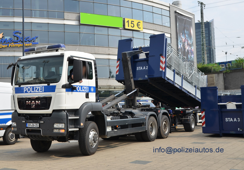 | Beschreibung: | Wechselladerfahrzeug (WLF) der Bundespolizei mit austauschbarem Ladungsträger (ATL), der hier mit Hamburger Gittern beladen ist. |