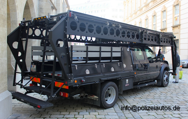 Teilgeschützer Spezialgrätekraftwagen mit Sonderanbau Mobiler hydraulischer Rampe für den Einsatz bei horizontal ungleichen Einsatzlagen. Hersteller ist die Firma Patriot3 Bilder und Info: Gerhard Hössl |