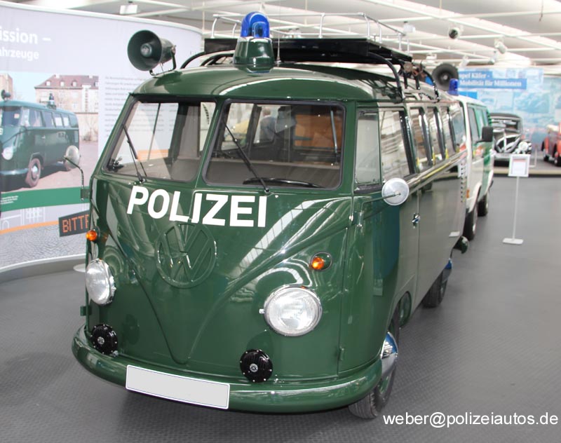 | Beschreibung: | Einsatzfahrzeug der bayerischen Polizei. Diese Fahrzeuge liefen bei der Polizei häufig als Mannschaftstransporter oder Unfallaufnahmefahrzeuge. Dieser T1 der Münchener Polizei ist mit einem Dachgepäcktrager ausgestattet um Utensilien zur Tatortaufnahme verstauen zu können. Desweiteren ist auf dem Dach ein großer Lautsprecher montiert. Technische Daten Baujahr: 1961 Motor: 4-Zylinder-Boxer, luftgekühlt Hubraum: 1192 ccm Leistung: 34 PS / 25 kW Höchstgeschwindigkeit: 110 km/h |