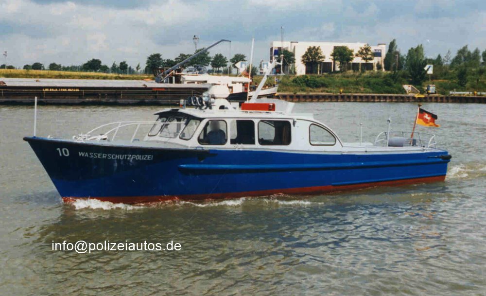 | Beschreibung: | Die alte W 10 der Wasserschutzpolizei Niedersachsen (1986). Technische Daten Heimathafen: Braunschweig Bootstyp: Streckenboot Baustoff: Stahl Bauwerft: Schless Baujahr: 1963 Länge: 10,50 m Breite: 2,20 m Tiefgang: 1,00 m Motor: 1 x 150 PS Höchstgeschwindigkeit: 17 km/h Ausgesondert: 1996 |