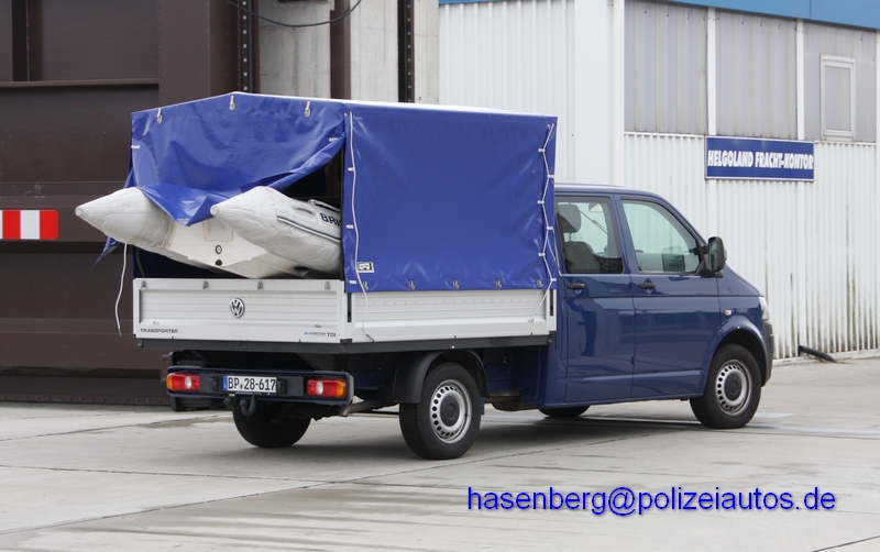 Das bis auf das Kennzeichen zivil gehaltene Fahrzeug wird am Standort Cuxhaven für den allgemeinen Transport von Versorgungsgütern, aber auch für "Fundstücke", genutzt. Auf dem Bild 4 wird gerade ein sichergestelltes Schlauchboot abtransportiert. |