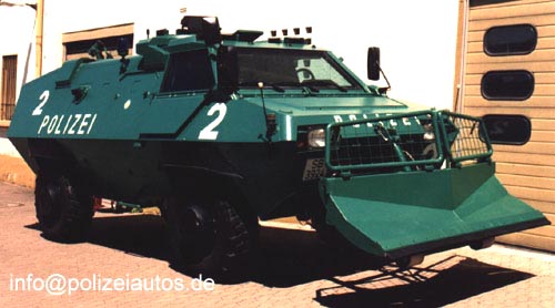 Sonderwagen 4 der saarländischen Polizei mit Räumschild.