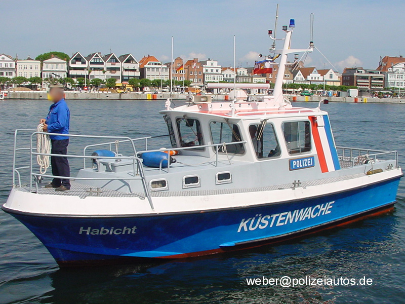 | Beschreibung: | Polizeiboot Habicht der WSP Schleswig-Holstein im Travemünder Hafen. Technische Daten Länge: 11,00 m Breite: 3,60 m Tiefgang: 1,00 m Geschwindigkeit: 20 kn Besatzung: 2 Personen. Das Boot wurde 2012 ersetzt. |