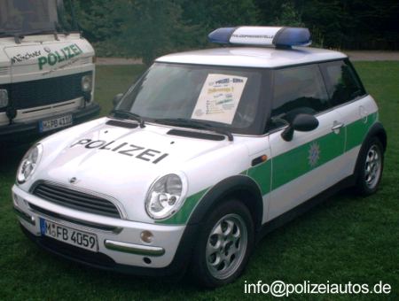 Beschreibung: Der Mini gehört seit dem Sommer 2002 zur Presse-und Öffentlichkeitsabteilung des Polizeipräsidiums München und wird aufgrund seines unkonventionellen Aussehens vorwiegend zum besseren Kontakt zwischen Polizei und Bürgern auf Messen, Veranstaltungen, Ausstellungen, etc. benutzt. Jedoch wird auch die Einsatztauglichkeit als Pressesprecherfahrzeug bei "normalen" Einsätzen überprüft und er ist deshalb wie jeder andere Streifenwagen mit Sondersignal und Funk ausgerüstet.