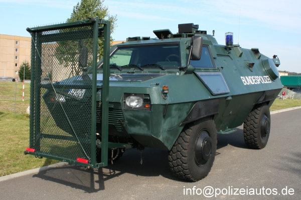 | Beschreibung: | gepanzerter Sonderwagen (SW IV), Thyssen TM-170, ausgerüstet mit Absperrgitter, hier in Fahrstellung und Beschriftung "Bundespolizei" |