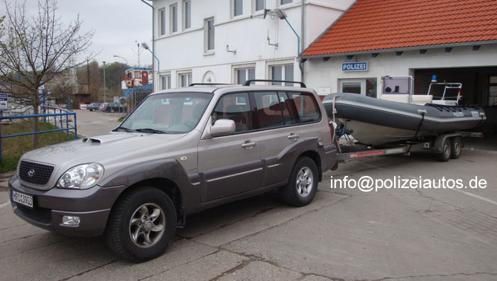 Zugfahrzeug mit Trailer und verladenem Boot der Wasserschutzpolizei