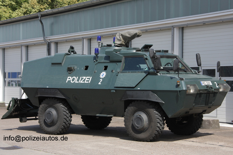 Es handelt sich um ein ehemaliges Fahrzeug aus Beständen des BGS. Auf dem Mehrzweckaufsatz ist hier eine Gewehrlafette aufgesetzt, der Räumschild ist am Fahrzeugheck in der Fahrstellung montiert. Fotos: Kai Hasenberg |