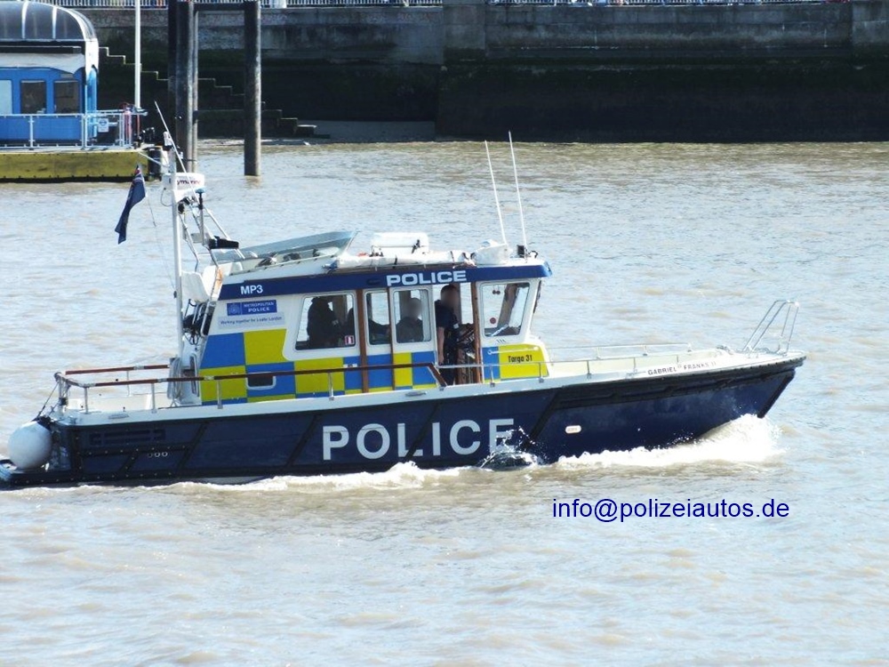 Streifenboot (MP 3) der Metropolitan Police im Battenberg-Design auf der Themse, Aufnahme 2012.