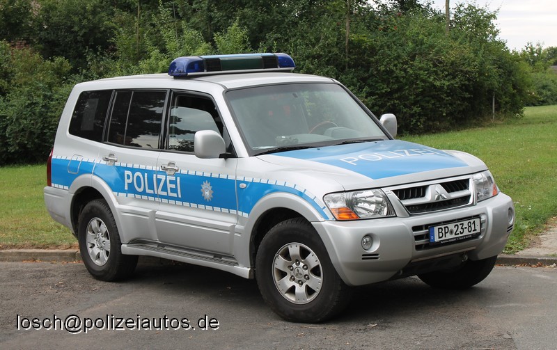 | Beschreibung: | Pkw Fu, gl - geländegängiger Funkstreifenwagen. Der Mitsubishi Pajero wird als Multifunktionsfahrzeug genutzt, u.a. als Führungsfahrzeug, als Zugfahrzeug für Transportanhänger, im Instandsetzungsdienst und beim Entschärfertrupp eingesetzt. Gegenüber diesem Fahrzeug sind Polizei-Schriftzug und Bundespolizeiwappen anders angeordnet; bei Indienststellung hatte der Pajero noch eine identische grüne Folienbeklebung. |