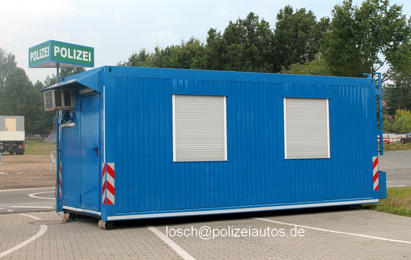 | Beschreibung: | Dieser Abrollbehälter der Polizei Niedersachsen wird bei Kontrollen oder Veranstaltungen als Mobile Wache genutzt. Der ehemals grüne Container wurde 2011 umlackiert und seitlich sowie am Heck mit Konturbeklebungen versehen. Hersteller: Fa.Hachmeister |