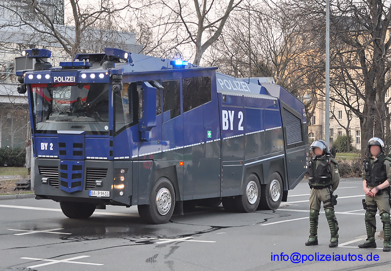 | Beschreibung: | Die Aufnahmen stammen von den Blockupy-Protesttagen im März 2015 in Frankfurt/Main. Der Wawe 10 der bayerischen Bereitschaftspolizei mit der Kennung BY 2 sperrt einen Straßenzug. Auf dem zweiten Foto stehen bayerische Grukw hintereinander aufgereiht, während Einsatzkräfte, u.a. aus Niedersachsen, vorbeilaufen. Fotos: Gottung |