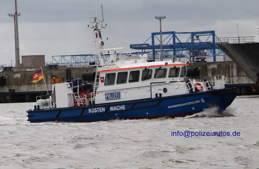 | Beschreibung: | Küstenboot W 5 der niedersächsischen Wasserschutzpolizei mit Heimathafen Wilhelmshaven. Technische Daten Länge: 21,0m Breite: 5,8m Baujahr: 2011 Werft: Damen Shipyards Group, Niederlande Typ: Damen Stan Patrol 2005 Geschwindigkeit: 25 – 35 Knoten Motorleistung: 880 – 1350 kW Fotos 1-3: sojus31 Foto 4: Jan Erik Karwacik |