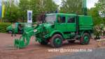 Zugmaschine mit Ladeschaufel und Ladekran zwischen Doppelkabine und Pritsche. Bei der ab 1996 ausgelieferten Folgegeneration auf Mercedes-Benz Unimog U2150 L wurde im Gegensatz zu diesem Fahrzeug der Ladekran am Heck montiert. |