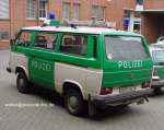 Kleines Gefangenentransportkraftfahrzeug des polizeilichen Einzeldienstes. Nach dem Auswechseln einer defekten Heckklappe wurde diese neu beklebt, wobei der grüne Streifen hier nicht bis zu den Seitenrändern reicht und der verwendete Polizei-Schriftzug auf der breiten Heckklappe recht schmal erscheint.