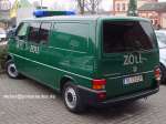 Diensthundeführerkraftwagen auf Basis des VW T4 mit kurzem Radstand mit Blaulichtbrücke und Dachschild (ZOLL) ohne TDI Aufschrift. Auch diese Streifenwagen kamen bis Mai 2004 an der Ostgrenze zum Einsatz, später an der Grenze zur Schweiz. Das Hoheitszeichen ist hier - völlig untypisch - nicht mittig auf der Tür aufgeklebt. Foto: Jörns |