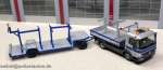 Der Aufbau des Ategos und der Anhänger entstanden komplett in Eigenbau aus Plastikprofilen und Riffelblech-Strukturplatten. Die aufwändige Lackierung und Details wie Staukästen, Feuerlöscher, Rundumkennleuchten und die eingeklappten Schilder am Heck runden das Gespann ab.
