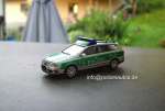 Vom silberfarbenen Grundmodell wurde die Dachreeling entfernt und das Modell komplett zerlegt. Nach der "Grün"-Lackierung wurde der Blaulichtbalken und die Beschriftung: POLIZEI, Wappen und die Fliegersichtkennung, aufgebracht. Anschließend wurde das Modell wieder zusammengesetzt und zum Schluß die Blinkerkappen und Türgriffe farbgerecht lackiert (Weber). |