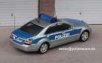 Sonderfahrzeug der Polizei Rheinland-Pfalz zur Begleitung von Geld- und Werttransporten. Das silberne Grundmodell wurde dem Vorbild entsprechend lackiert. Eine RTK, drei Antennen, die Erhebung auf dem Kofferraumdeckel, Beschriftung und Reflexstreifen, sowie Kennzeichen runden den Umbau ab.(Weber) |