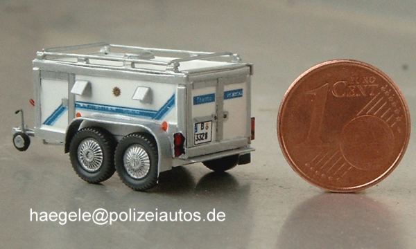 Der Anhänger wurde vollständig im Eigenbau erstellt. Lediglich der Dachlüfter, Räder und Achsen sind Serienteile. Die 1-Cent-Münze dient hier einmal als Größenvergleich für das Modell im Maßstab 1:87 (Haegele).