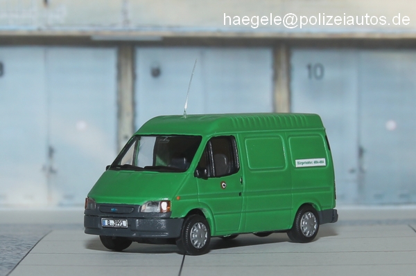 Beim Grundmodell wurden zunächst die Flügeltüren zu einer Heckklappe umgebaut. Anschließend wurden Details (u. a. die Stoßfänger) farblich hervorgehoben. Originalgetreue Kennzeichen und Aufkleber mit dem Bürgertelefon der Polizei Berlin (4664-4664) runden den Umbau ab (Haegele).