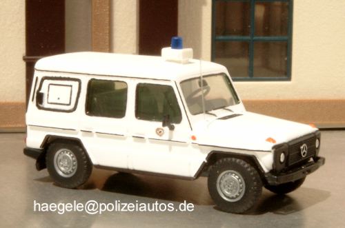 Das Grundmodell von Wiking wurde umfangreich mit herpa-Teilen ergänzt (Stoßstangen, Heckleuchten, Kühlergrill, Räder, Inneneinrichtung). Die Scheiben wurden mit verdünntem Lack leicht grün getönt. Warnanlage und verschlossene Heckscheibe runden den Umbau ab (Haegele).