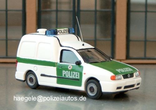 Kleintransporter (seriennah), Berlin 1:87 VW Caddy, Diensthundführerkraftwagen Grundmodell: (Artikel-Nr.: Rietze) Maßstab:0 Einsatzgebiet des Vorbilds: Diensthunde- und -pferdetransportfahrzeuge Berlin5523 Aufrufe seit 14.10.2002 Die Fenster im Heck wurden verschlossen und das Fahrzeug vorbildgerecht lackiert sowie mit einem Blaulichtbalken ausgestattet (Haegele). Zur Liste --- Serien- oder Sondermodelle --- Maßstab 1:43- Polizei Brandenburg 1:43- Bundespolizei (ehem. BGS ) 1:43- Polizei Hamburg 1:43- Polizei Niedersachsen 1:43- Polizei Nordrhein-Westfalen 1:43- Polizei Bayern 1:43- Polizei Berlin 1:43- Volkspolizei 1:43 Maßstab 1:87- Bundespolizei (1:87)- Feldjäger 1:87- Polizei Bremen 1:87- Polizei Hamburg 1:87- Bundesgrenzschutz (1:87)- Polizei Mecklenburg-Vorpommern 1:87...- Ordnungsamt (1:87)- Polizei Baden-Württemberg 1:87- Polizei Bayern 1:87- - Bereitschaftspolizei Bayern 1:87- - Kleintransporter (seriennah), Bayer...- - Pkw (seriennah), Bayern 1:87- Polizei Berlin 1:87- - Eigenbauten, Berlin 1:87- - Kleintransporter (seriennah), Berli...- - LKW (seriennah), Berlin 1:87- - PKW (seriennah), Berlin 1:87- Polizei Brandenburg 1:87- Polizei Hessen 1:87- Polizei Niedersachsen 1:87- Polizei Nordrhein-Westfalen 1:87- Erprobungsfahrzeuge 1:87- Polizei Rheinland-Pfalz 1:87- Polizei Sachsen 1:87- Polizei Schleswig Holstein 1:87- Polizei Thüringen 1:87- Polizei Sachsen-Anhalt 1:87- Volkspolizei 1:87- Modelle im Einsatz (Dioramen) 1:87- Zoll 1:87 Maßstab 1:160 Sonstige Maßstäbe