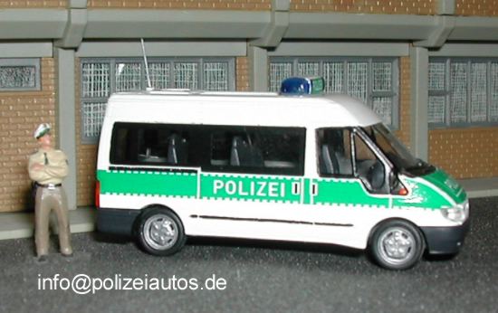 Polizei Niedersachsen 1:87 Ford Transit, Polizei Niedersachsen u.a. Grundmodell: (Artikel-Nr.: Rietze) Maßstab:0 Einsatzgebiet des Vorbilds: Gruppenkraftwagen und Busse Nds.6691 Aufrufe seit 17.04.2004 Fahrzeug mit Reflexstreifen. Umbau von Hans-Jürgen Friedlein, www.polizeimodell.de. Zur Liste --- Serien- oder Sondermodelle --- Maßstab 1:43- Polizei Brandenburg 1:43- Bundespolizei (ehem. BGS ) 1:43- Polizei Hamburg 1:43- Polizei Niedersachsen 1:43- Polizei Nordrhein-Westfalen 1:43- Polizei Bayern 1:43- Polizei Berlin 1:43- Volkspolizei 1:43 Maßstab 1:87- Bundespolizei (1:87)- Feldjäger 1:87- Polizei Bremen 1:87- Polizei Hamburg 1:87- Bundesgrenzschutz (1:87)- Polizei Mecklenburg-Vorpommern 1:87...- Ordnungsamt (1:87)- Polizei Baden-Württemberg 1:87- Polizei Bayern 1:87- - Bereitschaftspolizei Bayern 1:87- - Kleintransporter (seriennah), Bayer...- - Pkw (seriennah), Bayern 1:87- Polizei Berlin 1:87- - Eigenbauten, Berlin 1:87- - Kleintransporter (seriennah), Berli...- - LKW (seriennah), Berlin 1:87- - PKW (seriennah), Berlin 1:87- Polizei Brandenburg 1:87- Polizei Hessen 1:87- Polizei Niedersachsen 1:87- Polizei Nordrhein-Westfalen 1:87- Erprobungsfahrzeuge 1:87- Polizei Rheinland-Pfalz 1:87- Polizei Sachsen 1:87- Polizei Schleswig Holstein 1:87- Polizei Thüringen 1:87- Polizei Sachsen-Anhalt 1:87- Volkspolizei 1:87- Modelle im Einsatz (Dioramen) 1:87- Zoll 1:87 Maßstab 1:160 Sonstige Maßstäbe