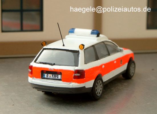 Das Grundmodell (Taxi) wurde nach dem Entfernen der Dachreeling und der Montage einer eigens angefertigten Dachplatte weiß und später entsprechend leuchtrot lackiert. Der Blaulichtbalken entstand im Eigenbau und der Umbau wurde insgesamt durch die Montage von Details (Antenne, Kennzeichen, Zusatzblinker, Frontblitzer) und farbliche Hervorhebungen (Nebelschlussleuchten, Rückfahrscheinwerfer) abgeschlossen (Haegele).