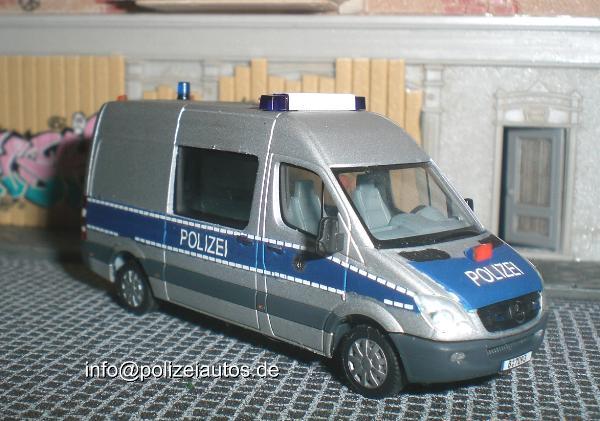 Ein Herpa-Modell wurde silber und blau lackiert. Nach dem Anbringen der Beschriftung mittels Decals von DS wurde das Modell mit einem Blaulichtbalken von Rietze, Zusatz-Blaulicht, Anhaltesignalgebern, Dachlüfter und 3. Bremslicht ausgestattet. Umbau: Robert Augustin