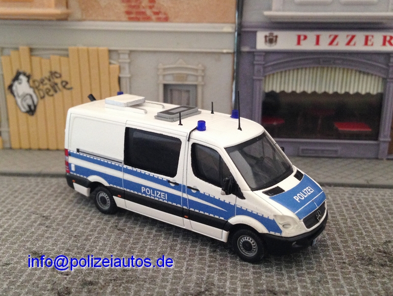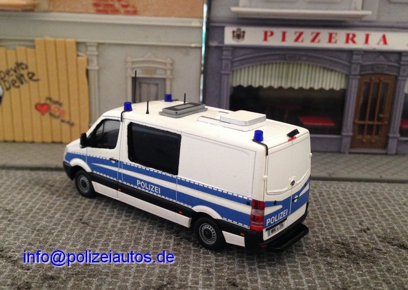 Bei dem Grundmodell von Herpa wurden zunächst die seitlichen Scheiben heraus gefräst, sowie das Modell mit Airbrush in weiß lackiert. Die aufgebrachten Decals und die Dachluke stammen von der Firma DS-Design. Abschließend wurden sämtliche Details wie (Blaulichter, Antennen, Ladesteckdose, Dachaufbau und Kennzeichen)angebracht.