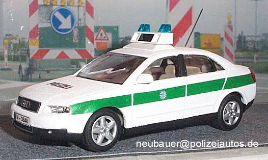 Modell wurde komplett umlackiert. Aufschrift "POLIZEI", sowie die Polizeisterne mit Landeswappen wurden angebracht. Das Modell wurde mit einer Wandel & Goltermann Blaulichtanlage, sowie einer Funkantenne ausgerüstet. (Eigenbau: Neubauer)