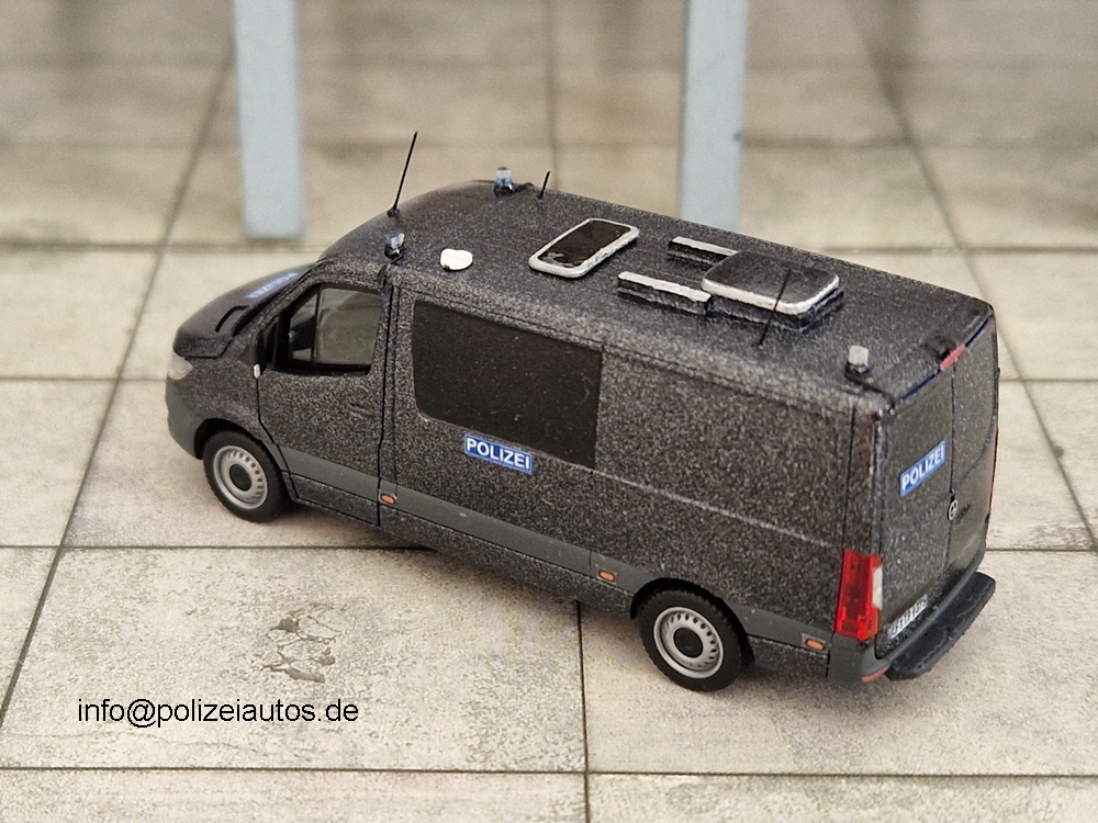 Nach dem Trocknen wurden Decals von SRM87 aufgebracht und das Fahrzeug mit Blaulichtern von MMH-Modellbau, Antennen, Trittstufe und einer Dachluke versehen.